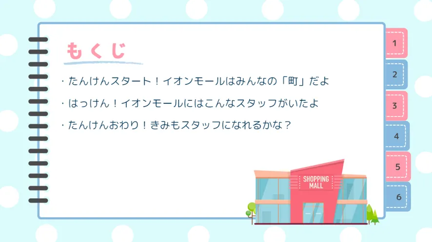 みんながよくあそびにくるイオンモール! じつは、このイオンモールのなかには、みんながたのしく、安全にすごせるように、がんばっている人たちがたくさんいるんだ。 まるでヒーローみたいな、その人たちのことを「おしごとスタッフ」ってよぶよ! さあ、どんなスタッフがいるか、いっしょにたんけんにでかけよう!しゅっぱーつ!🎉