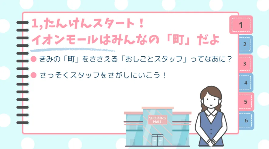 ここからは、イオンモールというひとつの「町」にいる、いろいろな「おしごとスタッフ」をたんけんするよ!