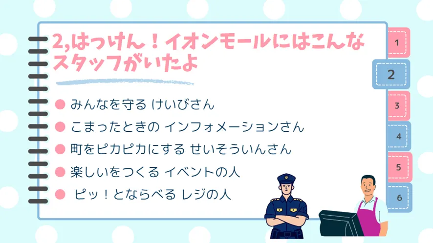 イオンモールの中をたんけんしたら、安心、おたすけ、せいけつなど、みんなを手伝ってくれるスタッフをたくさん見つけたよ!