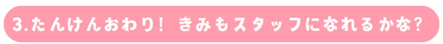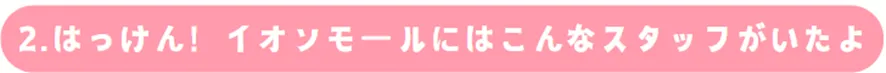 イオンモールの中には、たくさんのスタッフがかくれているよ。きみがいつも見かける、あの人もスタッフかもしれないね。これから、どんなおしごとスタッフに会えるのかな?考えるだけで、わくわくしてこない?さあ、どんなスタッフがいるか、見てみよう!
