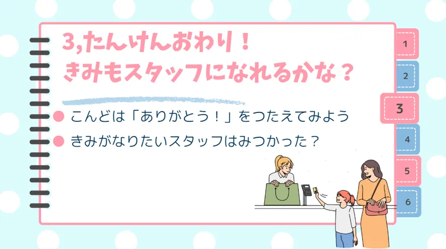 今日のたんけんで、イオンモールという「町」には、たくさんの人がはたらいていて、みんながおたがいに助け合っていることがわかったかな。つぎにイオンモールに行くときは、どんなスタッフさんがいるか、ぜひおうちの人といっしょにさがしてみてね!
