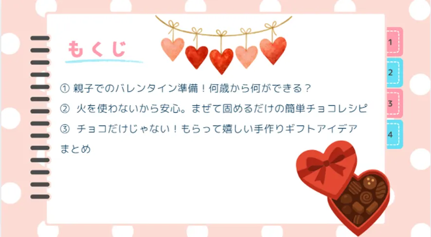 今回は、小さなお子さんと一緒に楽しめるバレンタインの手作りアイデアをご紹介しました。大切なのは、完璧に作ることよりも、親子で「楽しむ」という気持ち。