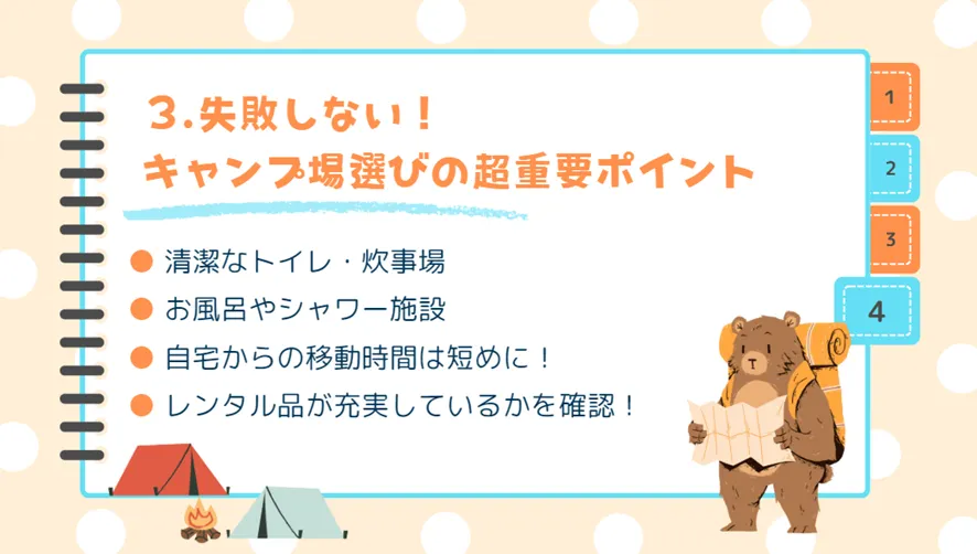 初めてのキャンプの楽しさを左右するのは、ズバリキャンプ場選びです。