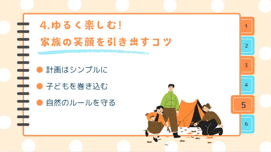 せっかくのキャンプ、家族みんなが疲れてしまっては意味がありません。家族全員が楽しめるように、以下の「ゆるキャンプのコツ」を取り入れてみてください。