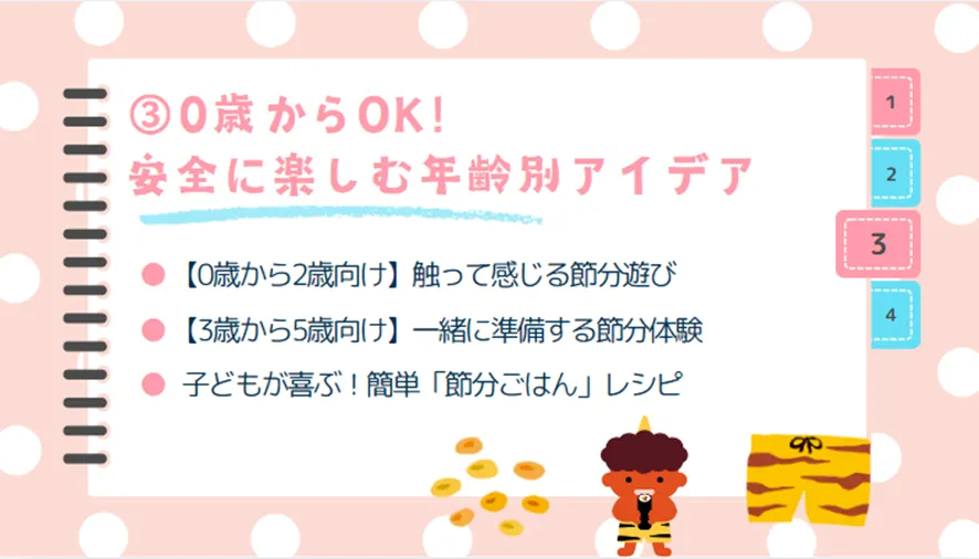 お子さまの成長に合わせて、0歳からでも無理なく安全に楽しめる節分の遊びや製作、食事のアイデアをご紹介!