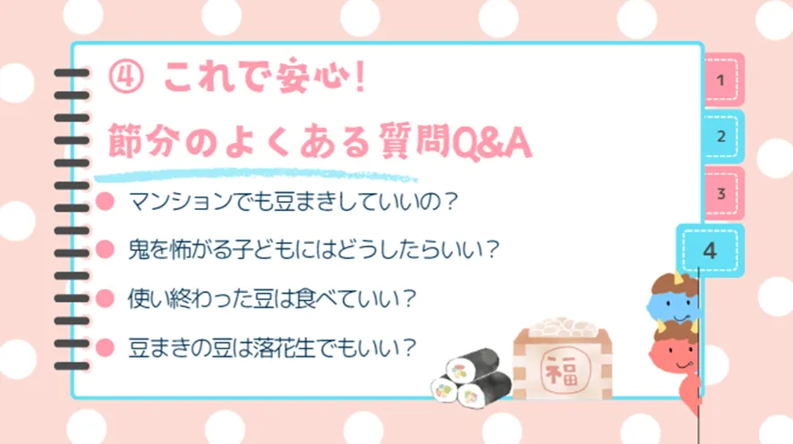 マンションでの豆まきの方法や、鬼を怖がるお子さまへの対応、地域による豆の違いなど、節分に関するよくある疑問にお答えします。