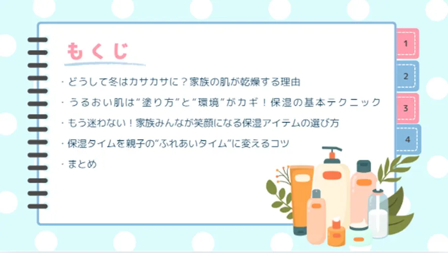 この記事でご紹介したヒントを参考に、面倒だった保湿タイムを、家族みんなの楽しい習慣に変えてみませんか?うるおいたっぷりの肌で、寒い冬を元気に楽しく乗り切りましょう!