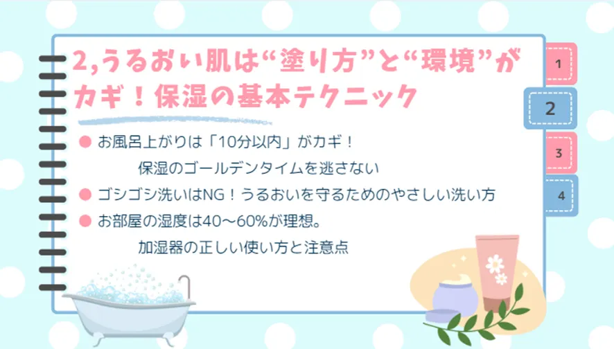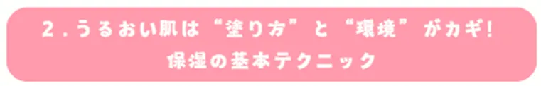 ここでは、保湿効果をぐんと高めるための3つの基本テクニック、「塗るタイミング」「洗い方」「お部屋の環境づくり」についてご紹介!