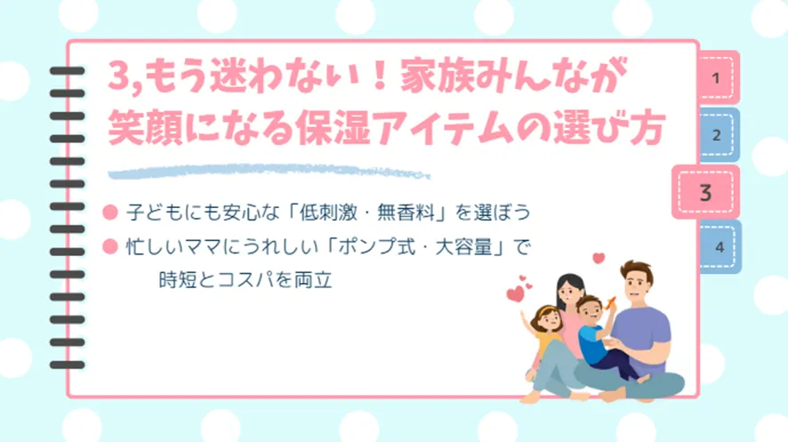 ここでは、家族みんなが気持ちよく使える保湿アイテムを選ぶための、シンプルな選び方のコツを紹介します。