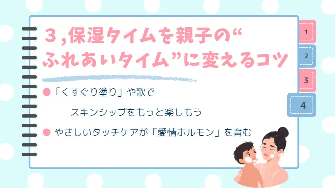面倒な保湿タイムを、親子の絆を深める楽しい時間に変えるヒントのご紹介です。