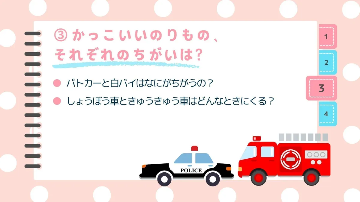 けいさつかんやしょうぼうしがのる、かっこいいのりものには、それぞれたいせつなやくわりがあるんだよ。