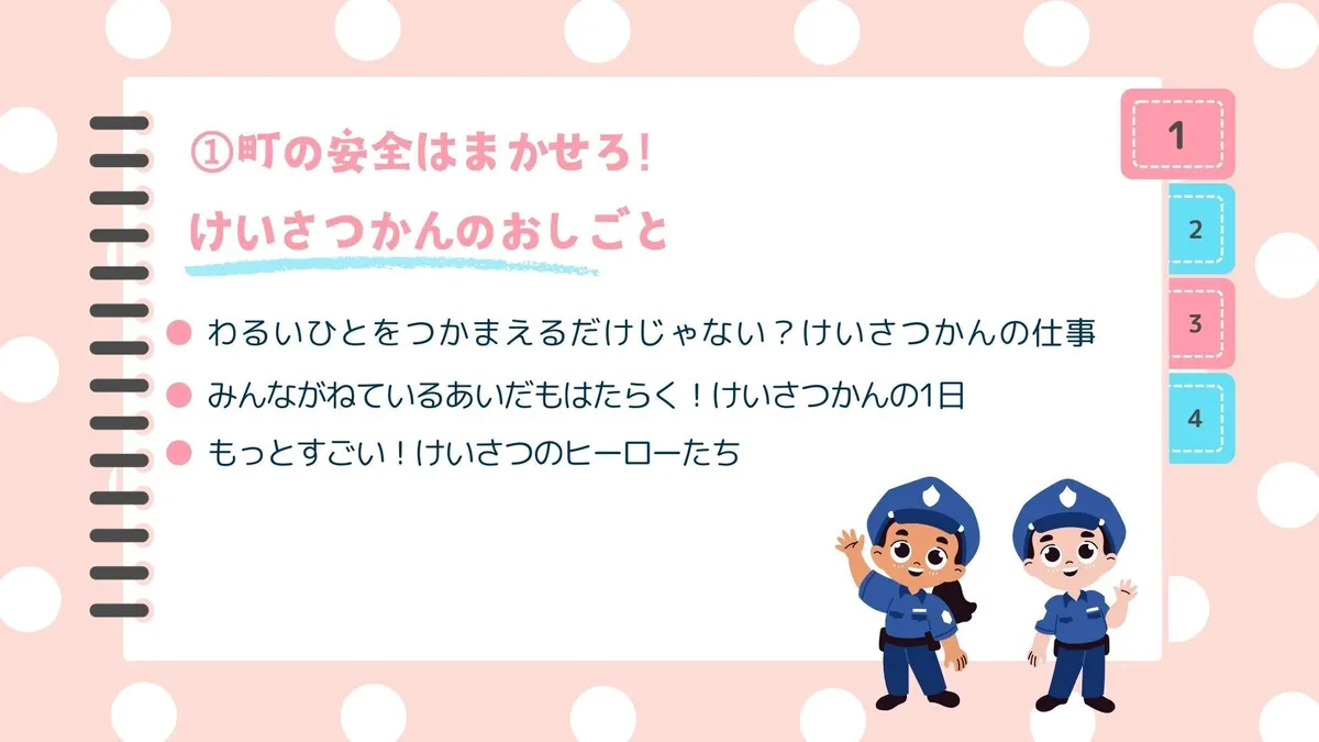 けいさつかんの仕事は、どろぼうやわるいことをした人をつかまえるだけじゃないよ。パトカーにのって町を見回るパトロールや、まいごになった子どもを探したり、どうろでこまらないように交通の整理をしてくれたりもするんだ。みんながいちばんよく見るこうばんのおまわりさんは、町の安心の、強い味方なんだよ!
