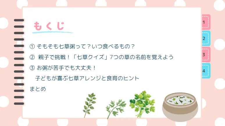 この記事では、七草がゆの由来や意味を子どもにも分かりやすい言葉で解説します。さらに、親子で盛り上がる「七草クイズ」や、お粥が苦手な子も喜ぶ簡単なアレンジレシピもご紹介♪
