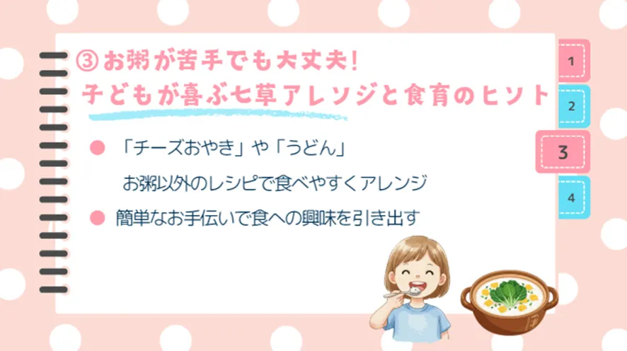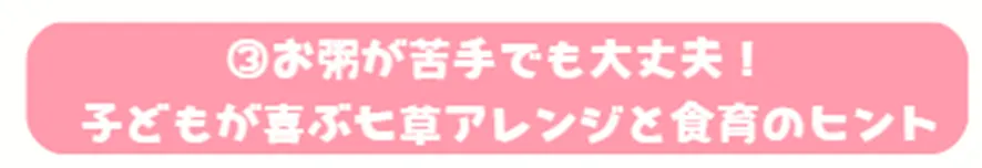 お粥の食感や七草の風味が苦手なお子さまも大丈夫。ちょっとした工夫で、七草をおいしく食べてもらうヒントをご紹介します。