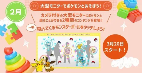 \開催中/大型モニターでポケモンとあそぼう! カメラ付きの大型モニターにポケモンとあそぶことができる2種類のプレイコンテンツが登場!\1つめ/ 飛んでくるモンスターボールにタッチしよう!大きなモニターに映し出されたモンスターボールにタッチするとポケモンがとびだすよ!\2つめ/